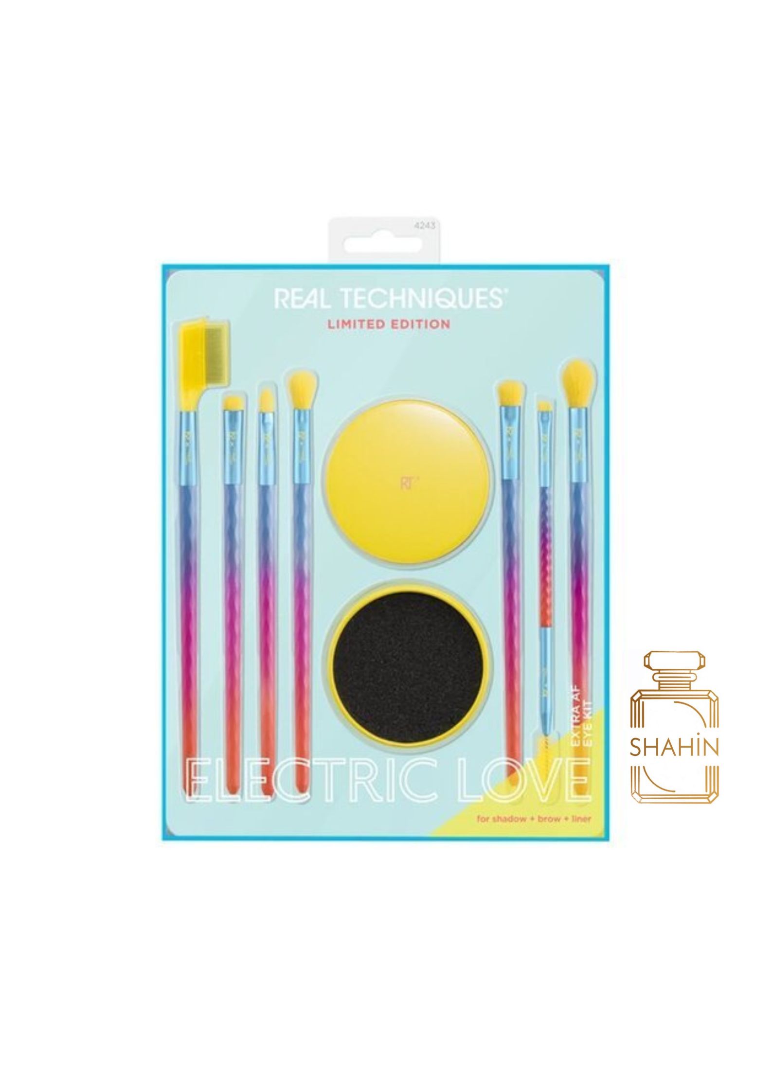 ست براش چشم 8تکه ریل تکنیک اصل REAL TECHNIQUES ELECTIC LOVE 4243 حاوی 7 عدد براش چشم و یک اسفنج تمیز کننده براش است که داخل یک قوطی فلزی قرار گرفته است،این ست از سری ست‌های لیمیتد ادیشن برند ریل تکنیک است که تقریبا تعداد محدودی از آن تولید شده است،ظاهر این براش‌ها برخلاف براش‌های دیگر این برند کمی فانتزی بوده و دسته‌های آن‌ها دارای طراحی جذاب و سه رنگ است،در این ست 6 مدل براش چشم کاربردی،یک براش ابرو دو طرفه و یک اسفنج پاک کننده وجود دارد که در ادامه آن‌ها بررسی کرده‌ایم،اصالت و اصل بودن این محصول مورد تضمین فروشگاه اینترنتی آرایشی شاهین میباشد.